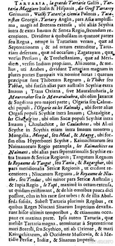 «Тартария – самая большая часть Азии, в большей мере на севере. Ранее называлась Скифией Внутреннего и Внешнего Имаума и Серикой. Делится на несколько частей или царств: Большая — на севере и на востоке, Пустынная на западе, Загатай, который граничит с Персией, Туркестан на юге, граничит с Индией. В Европе Тартария делится на несколько частей. Главным в Тартарии является королевство Тибет, который ранее был частью Скифии Внешнего Имаума; соединенный с Оксианой (район реки Амударьи – прим. мое), в прошлом Яксарт и большая часть Согдианы. Олгария или народность калмыки, которые раньше назывались оргасами, народность Скифии Внутреннего Имаума. Чазалгиты, в прошлом саки, народность Скифии Внутреннего Имаума. Чаулахиты, раньше называемые скифскими аланами, там же, в Скифии Внутреннего Имаума. Монгалия, Монгал или Моал и Магог, ранее называвшейся Гиперборейской Скифией. Каимачиты или небольшой Найманский регион, каимачиты или найманы, ранее северная часть Скифии Внешнего Имамума и Серики. Тангутское царство или Таню, и Багаргар в южной части Серики. Никанское царство или царство Ниухе или Тендук, ранее – малая часть южной Серики. Область Юпия, расположенная большей частью на востоке, по мнению некоторых. Их немногочисленные города описывает Абуль-Фида (арабский историк и географ из курдского рода Айюбидов, 1273-1331гг. – прим. мое). Существует очень много царей Тартарии, последние из которых из Никанского царства разрушили империю Китая, и все еще владеют большей ее частью. Но сама Большая Тартария ограничена с северной стороны Борейским или Скифским морем, на востоке – Каимачитским морем, на западе – Московией, на юге – Персией, Индией и Синской империей.»