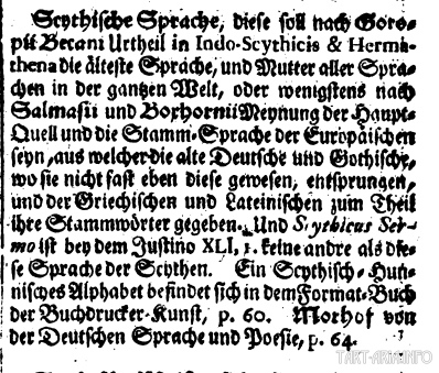 «По мнению Горопиуса Бекануса индо-скифиский и гермафена — старейший язык, и мать всех языков во всем мире, или, по крайней мере, по словам Салмазии и Борхорна Веннунга является изначальным. Источник и основа европейских языков, из которых старейшие немецкий и готский."