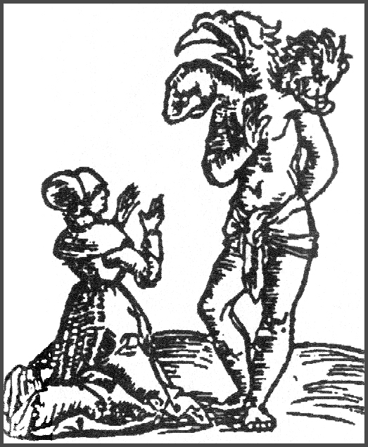 Известен также еще один рисунок изображения Трояна14. Разительные отличия в обоих рисунках позволяют относить их к разным изваяниям Трояна. На данном рисунке Троян представлен живым, а не как изваяние (стр. 22). Судя по фигуре коленопреклоненной женщины, этот чур Трояна был сделан в человеческий рост. Расположение ног совершенно такое же, как у изваяния в Шецине, что возможно объясняется некими существовавшими канонами для изображения Трояна. Все три головы не человеческие. Посередь — голова орла (небеса), справа – голова льва (земля), слева – голова змеи (подземелье)15. Таким образом, символически изображается власть Трояна над всеми тремя мирами. Фигура одета лишь в набедренную повязку, что роднит ее с изображением из Шецина. Из троичной символики, здесь, помимо трех глав, виден лишь благословляющий жест правой рукой: большой палец и мизинец отведены в стороны (вероятно, прежде были сомкнуты в кольцо), а указательный, средний и безымянный пальцы изображают трезубец. Левая рука Божества отведена за спину, что следует понимать как отображение представлений о принадлежании Трояна так же и миру Нави. Ладонь левой руки, вероятно, опущена вниз, зеркально к правой ладони. Данное изваяние поразительно напоминает изображение индийского Бога здоровья Дханвантари. Одинаковое положение ног, чем-то неуловимо общий разлет рук, Триглав изображен облаченным лишь в набедренную повязку, а Дханвантари с обнаженным торсом. На западнославянских землях найдено несколько трехглавых изваяний связываемых с культом Триглава: каменный чур из Вакан (Хорватия), каменный чур из Глейберга (Дания), деревянный стержень с тремя бородатыми головами, увенчанный фаллической шапкой, Свенденборг (Дания, 10 век) (Славянские древности, Т. 2, с. 389).