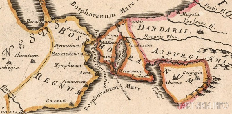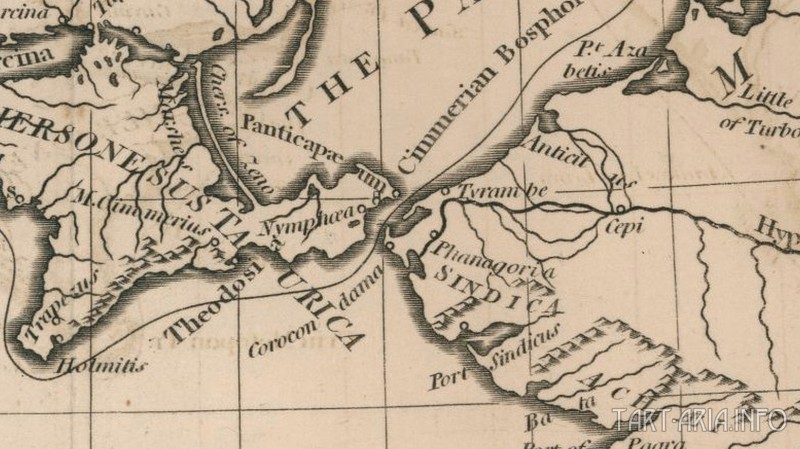 Здесь, не нужно быть экспертом, чтобы понять, что надпись на плите, выполненной очень искусно, сделана небрежно, неумело и гораздо позднее, чем была изготовлена сама плита. Такие образцы составляют подавляющее большинство из тех, что представлены на обозрение туристам на Тамани и в Керчи. Но вернёмся к географическим метаморфозам, отражённым на картах прошлых веков.