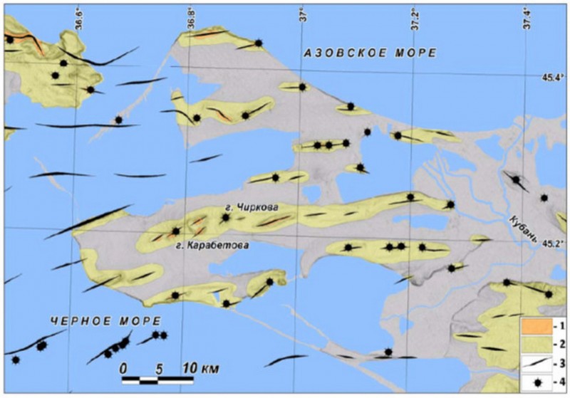 Тектоническая схема Таманского п-ова. Составлена с использованием данных: Шарданов, 1962; Самулева и др., 1970; Шнюков и др., 1981; Корсаков, Зарубин, 2001
