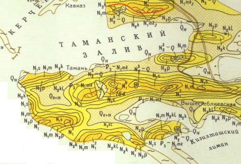 В тектоническом плане Таманский полуостров принадлежит Керченско-Таманскому поперечному прогибу и составляет восточную его часть. Этот прогиб заложен на западном продолжении мезозойских структур Западного Кавказа и южном борте Западно-Кубанского передового прогиба. Для Тамани характерна конседиментационная складчатость и в связи с этим соответствие слаборасчлененного рельефа и складчатых структур. Таким образом, здесь проявляются неотектонические движения.