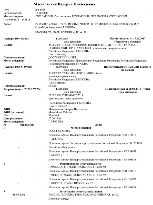Мошенница Массальская Валерия Николаевна. Приобретает имущество незаконным путем. Никогда не подписывает никаких документов. Работает в хорошо организованной ОПГ. Один из основных источников её дохода — прописывание в квартирах жильцов через своё ОПГ третьих лиц. Является организатором незаконного бизнеса, куратором ОПГ в Красносельском районе города Москвы и других.