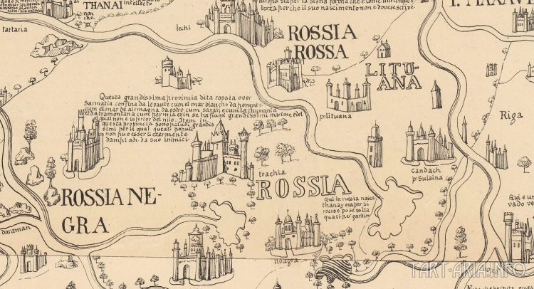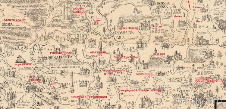 В том виде, как написано второе слово «Тартария», черным цветом, не встречается на карте практически нигде, кроме как в обозначениях Белой, Черной Руси. В Африке похоже оформлена надпись Эфиопия, и в Индии — Индия Прима. Можно предположить, что эта вторая надпись не является названием города, но некой области — государства. А первая, белая, более крупная надпись «Тартария» — название региона, как Азия, Месопотамия и др.