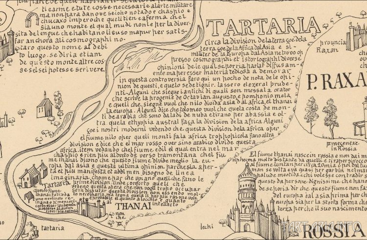 «Относительно разделения мира, то есть Азии от Африки и Европы от Азии, космографы и историографы высказывают различные мнения. Об этом можно было бы много спорить, но поскольку скучно останавливаться на этом противоречии, я сделаю краткую записку с их мнением и оставлю разумным решать, какому из них следует придерживаться наилучшим образом. Некоторые следуют за Древними — например, Мессалой (Messala), оратором, который писал о семье Октавиана Августа (Octavian Augustus,) и Помпонием Мелой (Pomponius Mela ) и тех, кто последовал за ними. Они утверждают, что именно Нил отделяет Азию от Африки и Танаи от Европы. Некоторые утверждают, что Птолемей говорит, что цепь Аравийских гор, которая лежит на стороне Нубии и простирается через Абассию (Abassia) и за ее пределы южной Эфиопии, должен считаться разделителем между Азией и Африкой. Другие, то есть современные авторы, отмечают, что эти подразделения Африки (либо по Нилу, либо по тем горам) делают Африку слишком маленькой. Говорят, что именно Красное море или Аравийский залив отделяет Африку от Азии. Более того, видя, что река Эдиль, впадающая в Каспийское море, течет с севера дальше, чем река Танай (Tanaus, Дон), они говорят, что именно эта Эдиль (Волга) лучше отделяет Европу от Азии. Это последнее мнение кажется более ясным и более очевидным; и не требует воображаемой линии, которая, как кажется, требуется тем, кто принимает другие версии. Тем не менее, я советую тем, кто смотрит на эту работу, не слишком беспокоиться об обсуждении этого раздела, учитывая, что это не очень важно. Пусть они выберут то, что кажется им наиболее разумным и вероятным как для глаз, так и для интеллекта.»