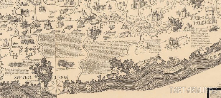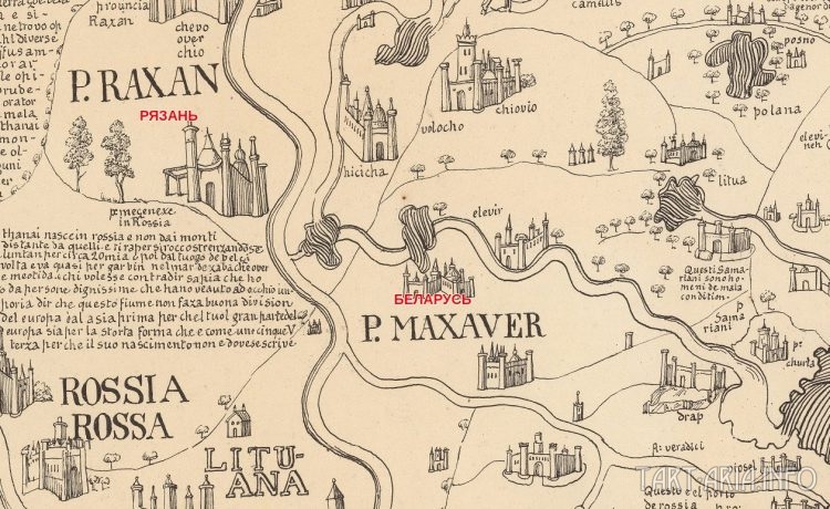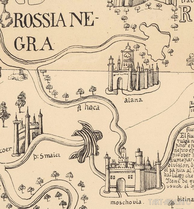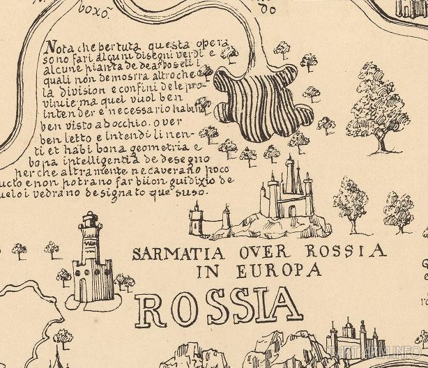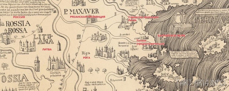 Не менее интригует надпись LATUANA западнее Рязанской области. Переводчик пишет, что в древние времена литовцы заселили гораздо более обширный регион, чем тот, который занят нынешним государством Литвы и это объясняет наличие имени в этой части карты.