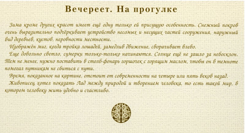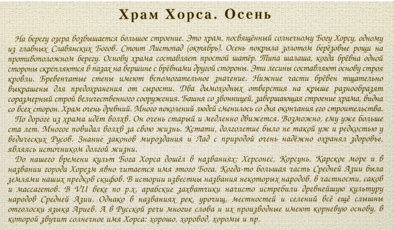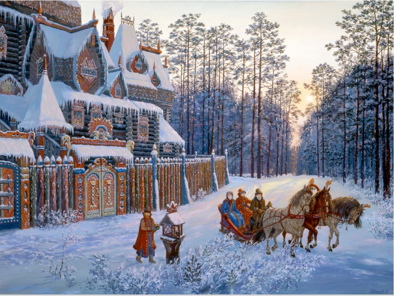 «Долгожданная встреча» Вечернее настроение царит в природе. Закатное солнце греет лучами осеннюю листву деревьев, мягко ложится на тёплые брёвна терема. В нижней части картины мы видим вернувшегося из дозора или похода воина, ведущего беседу с суженой. В правом нижнем углу изображено изваяние Бога, освещённое лучами солнца. Где и когда это могло произойти? Возможно, это древняя Артания или Русколань. А, может, это Валдайский край времён такого же древнего, былинного города Словенска.