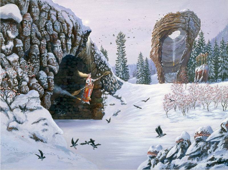 Так уж случилось, но самые древние образы русских ведических божеств наиболее искажены. Богиня-Йога — одна из них. Автор представил «злую бабу-ягу, костяную ногу» в её истинном обличье — молодой светловолосой женщиной. Она летит на конструкции, которую впоследствии назовут ступой. Струя реактивного пламени говорит о технических возможностях этого летательного аппарата — наследия технологии допотопного мира. В руках у Йогини балансир в виде двух метелок-вееров.