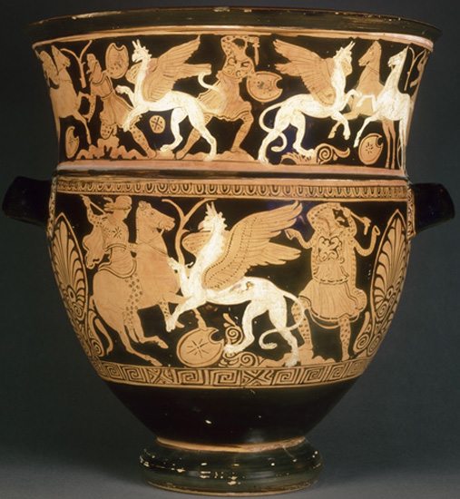 По легенде грифоны охраняли золото в Рипейских горах Гипербореи, в частности от мифических великанов аримаспов. Возникновение образа грифона пытаются искать в ассирийской, египетской и скифской культурах. Может быть происхождение этого фантастического животного и зарубежное. Но приняв во внимание «ареал обитания» грифона и то, что за редкими исключениями образ скифского грифа остается не сильно изменяющимся с IV века до н.э., представляется, что грифон не чужеродный в Скифии.