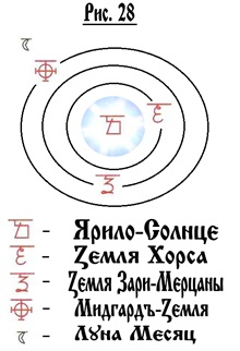 — вот Ярило — Солныщко. Вокруг него вращается Земля Хорса (на римский манер – Меркурий, или на греческий – Гермес). Обращается, если брать наше время, а у него – своё, обращается вокруг солнца за 88 земных суток, периодичность. Т.е. время там совершенно другое. Вторая планета, которая вращается это Земля Зари Мерцаны (Венера, по — римский). Третья – наша Мидгард – Земля с одной луной, хотя раньше их три было. Теперь заметьте, чем дальше свет от источника, тем спектр его изменяется: от ультрафиолетового – белого, он уходит к красному. Так же и время от источника: у Хорса будет одно время, у Мерцаны – другое, у Мидгарда – третье. Почему? А потому, что Земли вращаются со своей собственной частотой вращения. Т.е. Земли имеют свою собственную качающуюся частоту – они же ведь движутся в пространстве. Т.е. а качание, будем говорить, о влиянии на них, например, на Хорса, других Земель – нашей, допустим, Мерцаны и остальных, которые дальше. Качание, т.е. отдаление от круговой орбиты, т.е. тем самым вызваны изменения во времени.