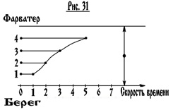 И заметьте, все народы, которые существуют, они все говорят о Реке Времени. А река, какой у нас имеет вид? Если брать в разрезе, то обычно один берег обрывистый, а другой полого-покатый (рис29). И заметьте, где наибольшая скорость реки будет? Вот здесь в точке, которая называется фарватер, здесь максимальная скорость течения: