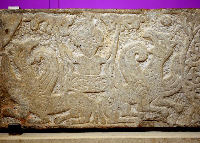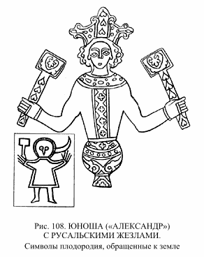 Например, жезлы «Александра» на ряде изображений повторяют жезл славянского божества на поясной бляшке из Микульчиц, датированной IX в.: человек в длинной одежде поднимает левой рукой турий рог, а в правой держит такой же короткий молоткообразный жезл.