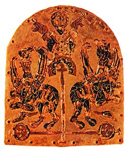Вот что говорит Б.А. Рыбаков (который, кстати, тесно связывал образ Дажьбога и Александра) в работе «Языческая символика русских украшений XII века»: «В этом хронологическом промежутке между X и XIII веками мы встретим множество грифонов и симарглов на колтах, на серебряных браслетах, на княжеском шлеме, на костяной шкатулке, в белокаменной резьбе владимиро-суздальской архитектуры и на изразцах Галича. Для нашей темы очень важно установить смысловое значение этих многочисленных изображений — являются ли они просто данью европейско-азиатской моде (великолепные грифоны есть на привозных тканях) или же в этих древних «собаках Зевса» все еще вкладывался какой-то языческий сакральный смысл? После изучения всей эволюции русского прикладного искусства XI — XIII вв. ответ на этот вопрос выясняется сам собой: к концу домонгольского периода все языческие в их сущности предметы убора княгинь и боярынь постепенно уступают место вещам с сюжетами чисто христианскими. Вместо русалок-сиринов и турьих рогов, вместо древа жизни и птиц, вместо грифонов появляются в конце XII — начале XIII в. изображения святых Бориса и Глеба или Иисуса Христа».