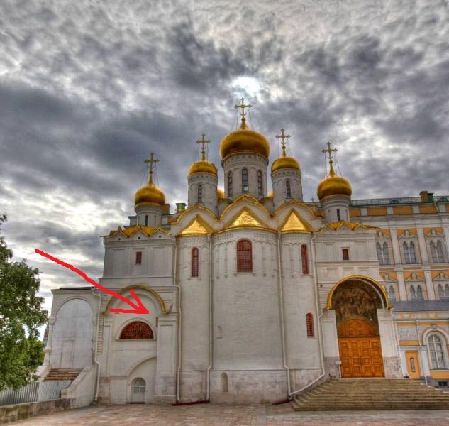 Наступление на отечественные древности прослеживается и на других направлениях. Так находятся свидетельства переделки внешнего вида церквей. Официальные источники говорят, что это было связано с необходимостью укрепления зданий, но скрытие фасадов более поздней кладкой могло носить и косметический характер. Например, в самом центре Москвы в Кремле на стене Благовещенского собора есть участок, где видимо при поздней реставрации вскрылась полость. Там можно увидеть капитель колонны очень похожую на капитель с известной церкви XII века Покрова-на-Нерли (грифоны с которой приводились в нашем исследовании), это может говорить о том, что прежний Благовещенский собор был ее современником. Канонической историей постройка Благовещенского собора датируется XV веком, а в XVI веке по официальной версии произошла та самая реконструкция, которая скрыла его фасад. Но XV век это далеко не XI-XIII, когда симарглы, грифоны и Дажьбог изображались достаточно широко. Вместе с тем упоминается, что в XV веке Благовещенский собор строился на месте более раннего храма. Может и в XV веке тоже была его реконструкция, и много ли еще церквей скрывают от нас прошлое нашей Родины?