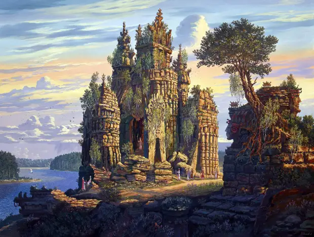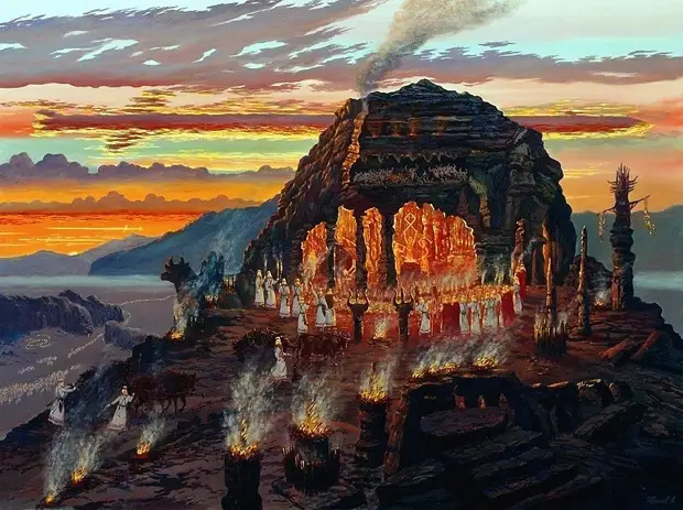 Давно уже Арии-Русы живут в этих местах. Их северную родину поглотили воды Студёного (Ледовитого) океана. На картине изображено очередное посещение храма волхвами.