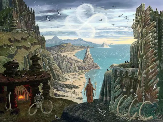 На картинах Всеволода Борисовича Иванова нас встречает мир, наполненный ясными красками. Это мир дохристианской Руси, изображаемый художником всегда возвышенно, празднично – он воспевает созданные им образы, отсылающие нас к языческому прошлому страны. Многочисленные храмы и изображения божеств, известных нам по редким упоминаниям, изображены на картинах Иванова: «Храм Свентовида», «Храм Радогоща», «Святилище статуи Полкана».