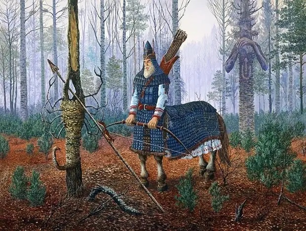 Фигура Китавраса, (Полкана) олицетворяющего образ стрельца, застыла посреди леса у дуплистого дерева, наросты на коре у которого явно напоминают облик скорпиона. В правой стороне картины выделяется дерево, в которое вселился Дух Просич. На стволе дерева изображены два ведических знака — символы Скорпиона и Стрельца.