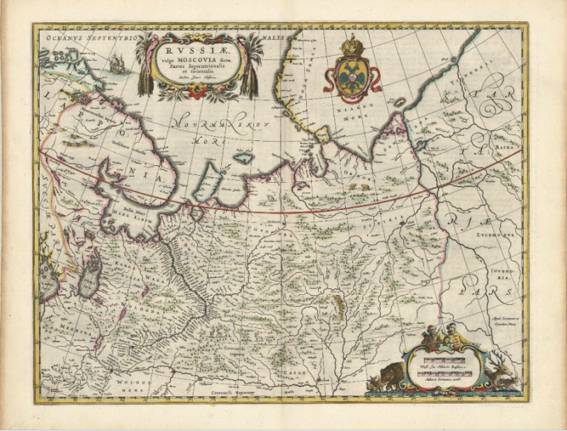 Двина также густо заселена, видим город на северном море которое тут названо Нормадским, белых медведей и не так далеко бурых.