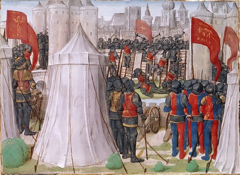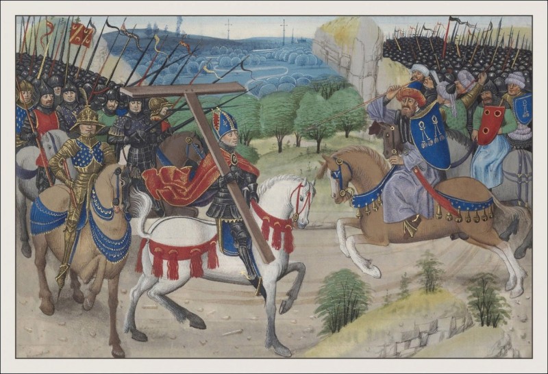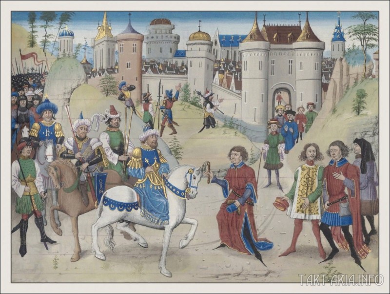 Ну, хорошо, возможно, кто-то скажет, что одна книга — это ещё не показатель. Может быть, стоит проверить другие источники по данному вопросу? Конечно, стоит! Именно так мы и сделаем. Нашим следующим объектом внимания станет книга под названием «Croniques abregies commençans au temps de Herode Antipas, persecuteur de la chrestienté, et finissant l'an de grace mil IIc et LXXVI», внутри которой есть очень интересные иллюстрации, описывающие времена крестовых походов. К примеру, на следующей иллюстрации изображено одно из крупнейших событий тех времён – осада Иерусалима войсками Саладина в 1187 году, завершившаяся капитуляцией крестоносцев: