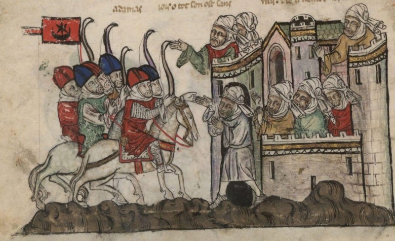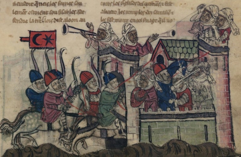Хоть данная иллюстрация и не содержит искомых символов (если не считать наверший зданий в виде полумесяцев, которые можно списать на присутствие там мусульман ещё до прихода христиан), она в очередной раз даёт нам понять, что войска Саладина с этнической точки зрения ничем не отличались от тех, против кого они вели войну. Даже стиль одежды в общем-то не сильно другой. Если вам интересен аспект, связанный с символами, то данное событие можно увидеть и в других источниках (на обоих следующих иллюстрациях изображён искомый символ в различных вариациях):