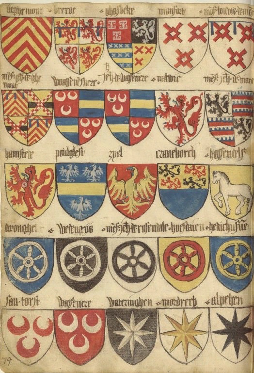 «Ancien armorial colorié, où sont figurés les blasons de différents princes et seigneurs de France, Allemagne, Flandre, Angleterre, Espagne, Italie, etc» (15 век).