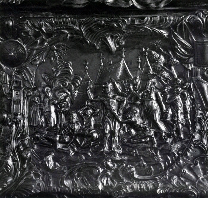 Данный артефакт украшен тематическими рельефами, изображающими важнейшие события из его жизни. Один из рельефов демонстрирует момент вступления Александра Невского в Псков и освобождение города от Ливонского ордена в 1242 году. Данный рельеф интересен тем, что демонстрирует всё те же символы полумесяцев и звёзд на навершиях городских зданий: