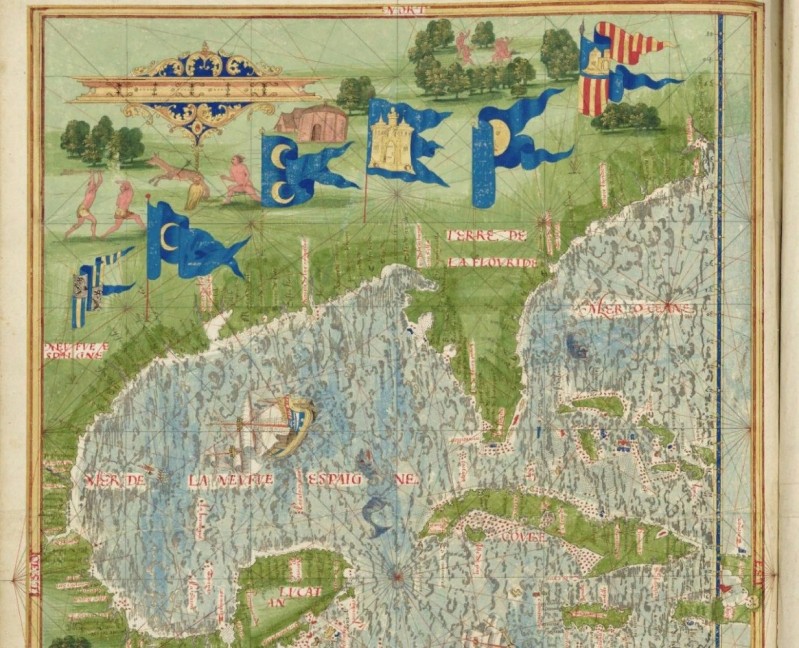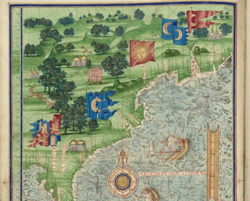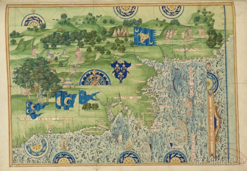То, что вы видите на изображениях, есть ни что иное, как южное побережье нынешней территории США (которую можно без труда идентифицировать по Флориде и полуострову Юкатан, названия которых написаны на карте). А вот часть нынешней Канады из того же атласа (её восточное побережье, если быть точным):