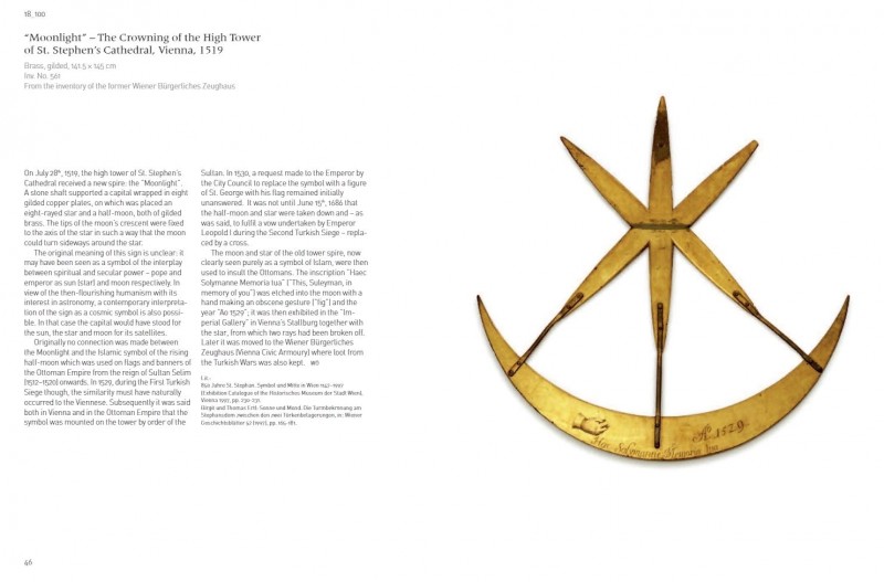 Надпись «Haec Solymanne Memoria tua» переводится примерно как «Это тебе на память, Сулейман». Из комментариев музея мы узнаем кое-какие новые детали, которые сразу же вызывают подозрение. Оказывается, им известно, что дата установки данного символа на собор – 28 июля 1519 года (ни днём раньше, ни днём позднее). А вот оригинальное значение данного символа «им не ясно». У них есть лишь догадки о том, что символ мог символизировать «взаимосвязь духовной и светской власти, где папа римский — это звезда, а император — это полумесяц», ну, или уже привычные нам «это просто луна и звезда» (надеюсь, что прочитав это, вы прочувствовали всю бредовость их объяснений). Более того, по их версии, сразу через год после первой осады города (в 1530 году), городской совет отправил запрос императору (видимо, Фердинанду 1-му) на то, чтобы заменить данный символ фигурой Святого Георга. Однако, только спустя 156 лет (!), в 1686 году, полумесяц со звездой был заменён на крест с двуглавым орлом, и то, в рамках выполнения некой клятвы, данной императором Леопольдом 1-ым в ходе второй осады города (интересно, кому и зачем он давал эту клятву?). Там также написано, что «впоследствии обе стороны сошлись во мнении о том, что символ полумесяца и звезды был установлен на собор по приказу султана» (очевидно, Сулеймана).