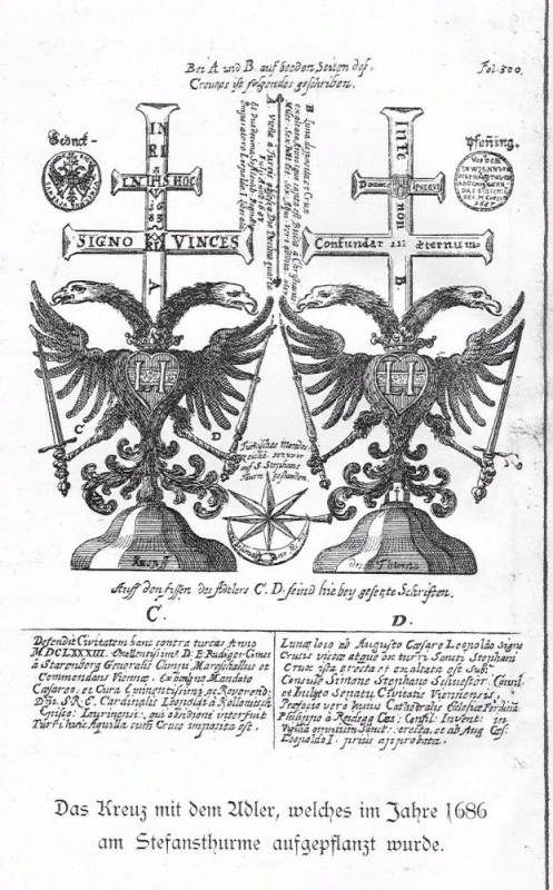 В 1686 году, спустя 3 года после второй осады города «Турками/Османами», произошло своего рода «торжественное» событие снятия с собора полумесяца со звездой и водружение вместо него двуглавого орла с крестом. Помимо очевидного факта замены одного символа на другой, интересна та церемониальность (или, скорее, показушность), с которой это всё было сделано. Для того, чтобы понять, о чём я говорю, вам нужно будет увидеть следующую гравюру: