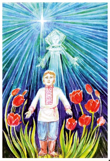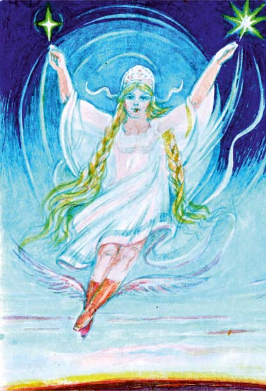 ДЕВУШКА — ЛЕТАВИЦА. Красоту имеет неописанную. Волосы золотистые — до самой земли, одежда — легкая, светлая, но самая главная деталь — сапожки ее красные. В них сила Летавицы и заключена. С их помощью она летает, с их помощью она колдует, с их помощью она людей привораживает.