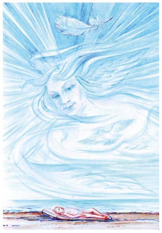 ВНЕШНИЙ ВИД: Голова его увенчана лучами и крыльями, а на торсе изображена летящая птица. Лёгкий, как перышко, да и сам иногда превращается в перо и качается в вышине, отдыхая от забот.
