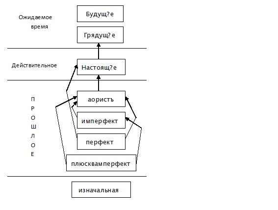В старой древнерусской грамматике использовались шесть форм времени. Т.е. видите, если в современный или, допустим, петровский язык — три формы времени; николаевский язык после реформы – три формы времени; советский язык – три формы времени (прошедшее, настоящее, будущее), то древнерусский язык имел шесть: будущее, настоящее, аорист, имперфект, перфект, плюсквамперфект.
