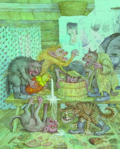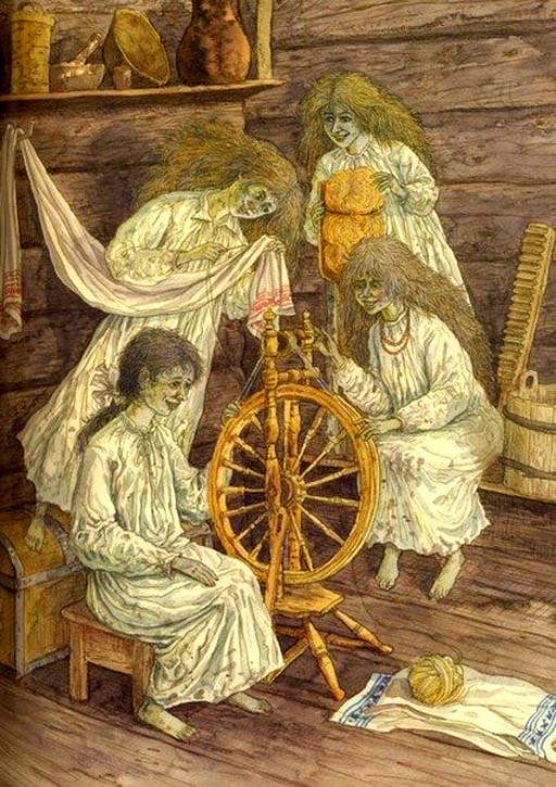 КИКИМОРА ДОМОВАЯ – один из домашних духов, причем злой и вредный дух, маленькая гадкая бабёнка. Любит похулиганить в доме, гремит посудой, бросает и бьет посуду, портит продукты, кидается луковицами из подполья или из-за печки, стучит вьюшками, крышками от коробов. Днем кикиморы неактивны, а по ночам начинают шалить. По большей части они не причиняют серьезного вреда человеку, в основном лишь устраивают небольшие проказы: то стучат чем-то по ночам, то скрипеть начинают. То вдруг загремит, затрещит на потолке; то впотьмах подкатиться клубком к кому либо из семьи по ноги и собьет его; то когда все уснут, ходит по избе, урчит, ревет и сопит как медвежонок; то средь ночи запрыгает по полу синими огоньками. Если кикимора невзлюбила кого из членов семьи, то проказы станут куда серьезнее: дух начнет ломать мебель, бить посуду, изводить домашнюю скотину. Любимое занятие кикиморы – прясть пряжу: порой сядет ночью в углу и начинает работать, и так до утра, но толку от этой работы нет, лишь спутает нитки, да пряжу порвет. Иногда кикимора оборачивается серой кошкой.