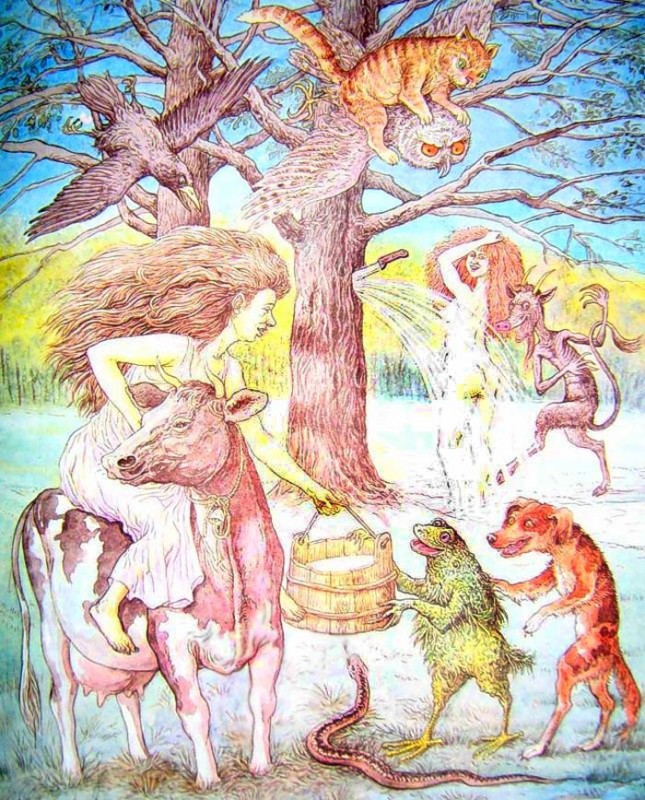В этот же день ведьмы ездили на корову с пастбища до околицы. Они никогда не носили с собой молока — им достаточно было вставить нож в дерево, и оно начинало источаться оттуда. Под молочными ведьмами подозревали отдельных местных женщин, способных осуществлять колдовские действия не только в своем естественном облике (на злой промысел они выходили обнаженными или в рубашке, с взлохмаченной головой), но и преобразованных в какое-то зооморфное существо: лягушку-рапуху, собаку, кошку, ласку, курицу, ворона, козодоя (казадоя), гадюку, ящерицу, муху.