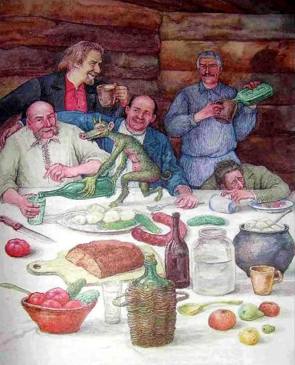КАМПАНИЯ. Надо признать, что были среди славянских богов такие, кто в полной мере наслаждался пьянством — Хмель, например и Квасура. Говорят, что сейчас появился НОВЫЙ дух — Самогоныч, вот он — тоже из этой компании.