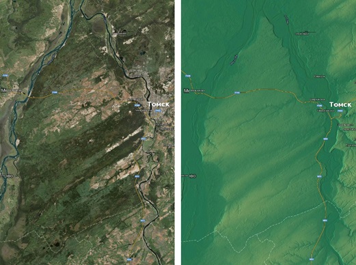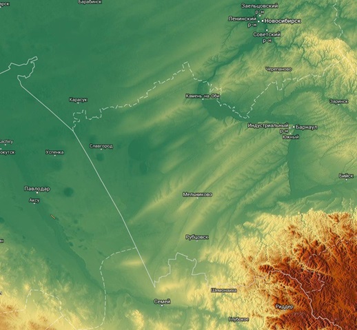 Если посмотреть на то, как выглядит данное место на карте рельефа, то, во-первых, мы увидим, что это именно углубления в террасе левого западного берега Оби, а во-вторых, что параллельно следу №1 ниже его на юго-восток, на расстоянии 42 км и 75 км от его оси можно увидеть ещё две «борозды», параллельные ему (на данной карте более тёмный зелёный цвет обозначает более низкие места, как это принято на физических картах). При этом ближний след более длинный и изрезан оврагами и руслами небольших речек, а также руслом реки Алей, вдоль которых распахано множество полей, поэтому он не так чётко виден на обычных снимках, как основные следы. На карте рельефа этот след идёт от города Рубцовск, через который протекает река Алей. При этом если до населённого пункта Поспелиха русло реки Алей имеет достаточно сложную форму, то далее, до впадения в реку Обь, течёт внутри узкой достаточно прямой полосы шириной 1 км, которая идёт как раз параллельно следу №1.