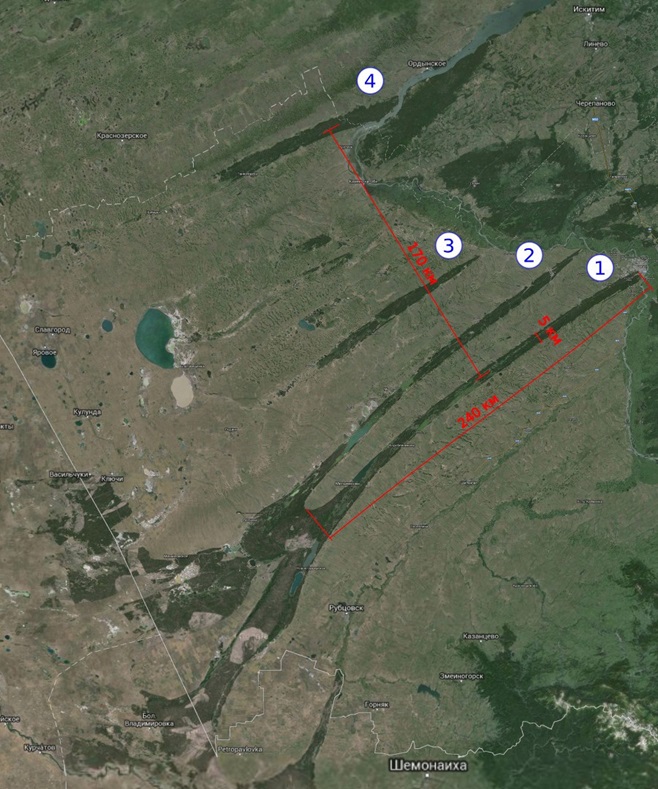 Проблема в том, что в случае подобной массированной равномерной бомбардировки мы должны наблюдать на территории Сибири как раз более-менее равномерную сетку из воронок, но, увы, мы её там не наблюдаем. Некоторое количество воронок и других следов наблюдается в районе Урала и Поволжья (восточный берег Волги). А дальше от Урала на восток подобных следов, характерных для ядерных взрывов, не наблюдается. Но, если внимательно посмотреть на спутниковые снимки территории Сибири, то обнаруживаются там совсем другие следы! Причём они хорошо видны как на спутниковых снимках, так и на топографических картах, и большинству известны как «Сибирские ленточные боры».