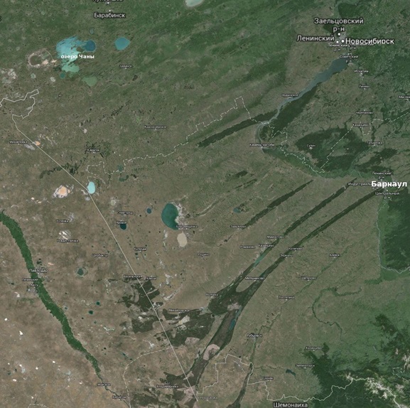 Но и это ещё не всё. Если от следа №4 продвигаться дальше на северо-запад, то мы увидим множество смазанных полос, которые являются следами от падения гигантского количества более «мелких» обломков. Например, они очень хорошо видны в районе озера Чаны.