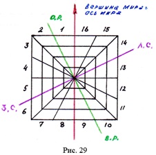Проще это сделать, нарисовав квадрат, потому что его удобнее делить как пополам, так и по диагоналям, чтобы у вас получилось ровно 16 частей. Сверху ставим Вершину Мира – это прообраз уходящая вверх Гора Мира в Даарии. Нумеруем против часовой стрелки части сторон квадрата от 1 – 16, начиная от Вершины Мира.