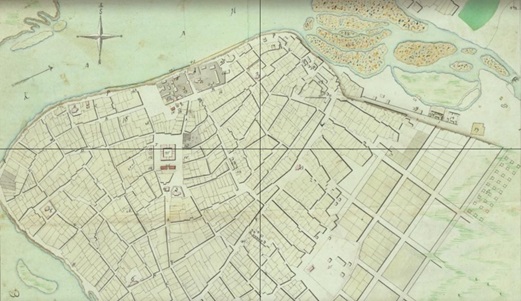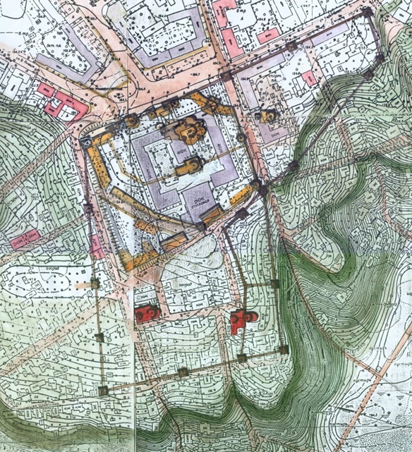Если мы посмотрим на города в европейской части России, то там мы увидим именно такую картину. Московский, Нижегородский, Казанский кремли намертво определили структуру старого центра города. При этом везде основные магистрали ведут к крепостным воротам. Аналогичную картину мы наблюдаем и в тех городах, где крепости до наших дней не сохранились. Например, вот план тоже не сохранившейся крепости в городе Воронеж, который наложен на современную топографическую карту. Очень хорошо видно, что структура улиц, ведущих к воротам, а также центральная площадь сохранились до наших дней.