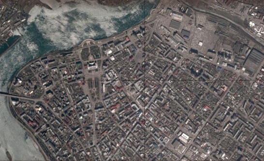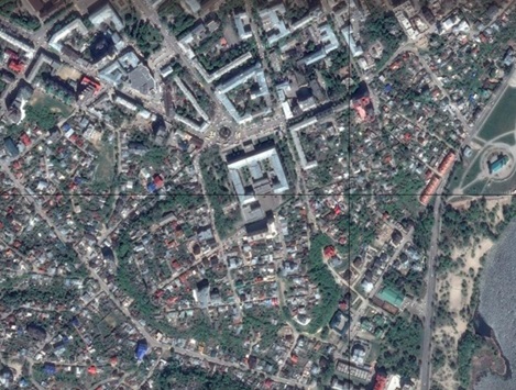 Очень хорошо видно, что старые здания снесены целыми кварталами, построено много новых современных зданий, но вся структура улиц осталась неизменной. Улицы до сих пор сходятся к воротам уже давно не существующего кремля.