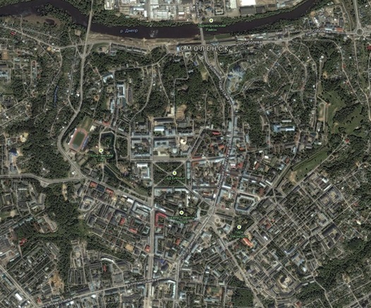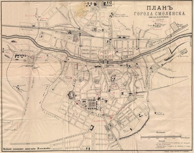 Город Смоленск, от крепости остались фрагменты стен. Сама крепость, кстати, разрушена во время войны 1812 года. Вот план 1898 года, а также современный вид со спутника. Вся структура улиц практически полностью сохранилась до наших дней.