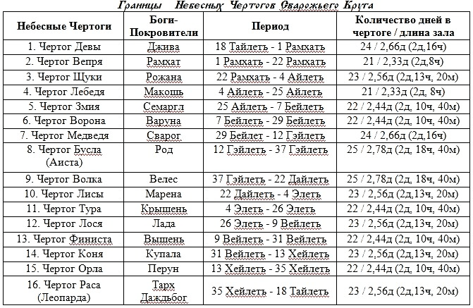 Теперь найдите свою дату рождения по Славянскому календарю. И посмотрите, в каком Чертоге вы родились. Находите число, и смотрите: в каком периоде Чертога это число, но только, если у кого-то выпала грань Чертога, то смотрите еще – до 14 – го славянского часа или после.