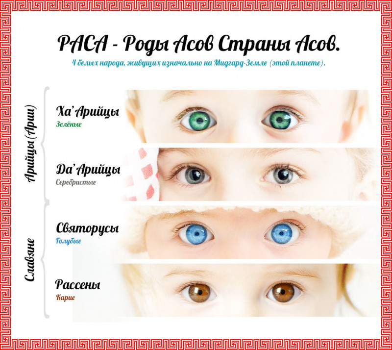 Святорусы. Рост 175 до 300 см. Глаза небесные, т.е. васильковые, синие, озерные, некоторые неправильно говорят: голубые глаза. Голубой это не цвет – это образ жизни. Поэтому голубого в нашем спектре не было.