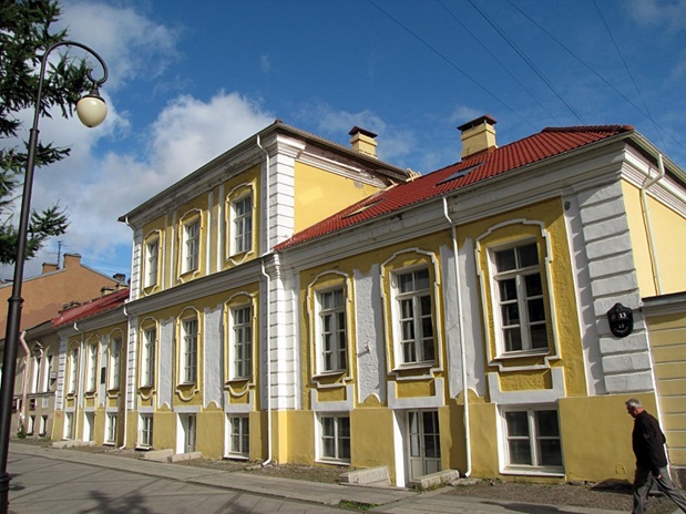 Это дом Троекурова на Васильевском острове. Обратите внимание на входы в здание, которые ниже современного уровня земли на метр, да и весь первый этаж смотрится совершенно негармонично. Ни один вменяемый архитектор такого запроектировать не мог. При этом если почитать официальное описание, то там мы можем прочитать вот такой шедевр «В 1723-1730 годах здесь для него было построено каменное одноэтажное здание с мезонином»!!!