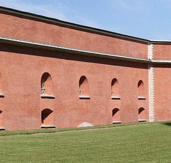 А это вид сзади, снова окна у самой земли. При этом под третьим окном справа мы видим засыпанный канал, аналогичный которому можно увидеть откопанным выше на фото Невской крутины. Такие каналы в стенах обычно делают для спуска лишней воды наружу во время паводка. Делать же данный канал и засыпать его потом землёй нет вообще никакого смысла.
