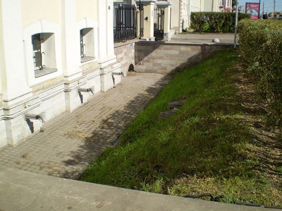 Дворец Меньшикова на Университетской набережной Васильевского острова. Фундамент значительно ниже современного уровня земли, окна фактически в уровень земли, пол ниже уровня окон ещё минимум на метр, а должен быть хотя бы на полметра выше, в итоге получаем примерно те же полтора метра лишней земли.