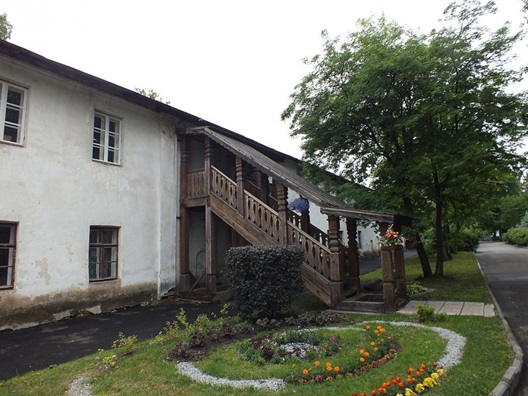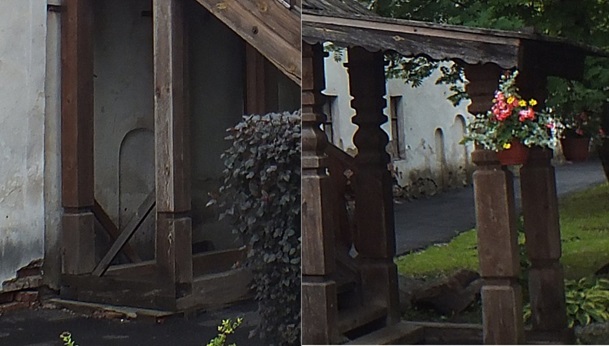 Одна заложенная арка от двери видна под лестницей, при этом хорошо видно насколько ниже должен быть исходный уровень земли. Ещё две арки дальше по зданию также заложены, их видно внизу стены между стоек нижней части деревянного крыльца. При этом ближняя арка точно такая же, как под крыльцом, а дальняя явно выше и шире, больше похожая на грузовые ворота склада.