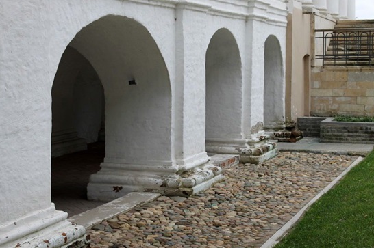 Очень хорошо видно, что храмы стоят на разной высоте. При этом в старом храме уровень пола галереи первого этажа почти на полметра ниже, чем современный уровень земли.