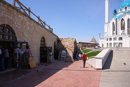Увы, примерно такой же уровень засыпки наблюдается вдоль многих стен, особенно вдоль тех, где ещё не было реконструкции и реставрации. Вот так выглядит фрагмент стены после реконструкции в районе новой мечети Кул-Шариф.